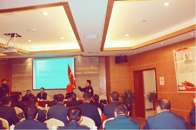 會議首先由各領導分別為義務巡邏員代表佩戴紅袖標及由郭偉平副支隊長為全市保安服務業(yè)義務巡邏隊授旗,由江蘇康平保安服務有限公司義務巡邏隊隊長王瑋接旗,其次由朱永忠大隊長介紹了義務巡邏隊的成立背景,明確了義務巡邏員工作職責、物建范圍及管理、獎勵機制。接著由義務巡邏員代表、江蘇康平保安服務有限公司總經理范習剛及蘇州市保安服務行業(yè)協(xié)會會長畢坤明分別做了表態(tài)發(fā)言。總經理范習剛表示積極響應上級號召“保平安,護民生”,嚴格履行保安員的職責,依法辦事,文明巡邏,為創(chuàng)建文明和諧蘇州貢獻自己的力量。畢會長強調了成立義務巡邏隊的重要性、必要性及緊迫性。成立義務巡邏隊強化了保安員的職責,豐富了保安員的內涵,增強了保安員的榮譽感,提高了保安員在社會的地位及影響力。這是保安服務業(yè)的偉大創(chuàng)舉,符合十八屆五中全會的理念,符合蘇州的城市精神,符合現(xiàn)代社會發(fā)展的需要,是蘇州人民渴望建設平安蘇州的愿望及自身發(fā)展的需要。