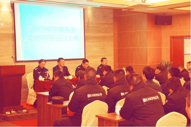 2015年12月3日,蘇州市保安服務業(yè)義務巡邏隊成立大會在江蘇康平保安服務有限公司召開。會議由蘇州市公安局治安支隊監(jiān)管大隊教導員陸萍主持,蘇州市公安局治安支隊副支隊長郭偉平、蘇州市公安局治安支隊監(jiān)管大隊大隊長朱永忠及蘇州市保安服務行業(yè)協(xié)會會長畢坤明出席了會議。蘇州市公安局各分局治安大隊領導及蘇州市五家保安服務有限公司巡邏員代表50余人參加了會議。